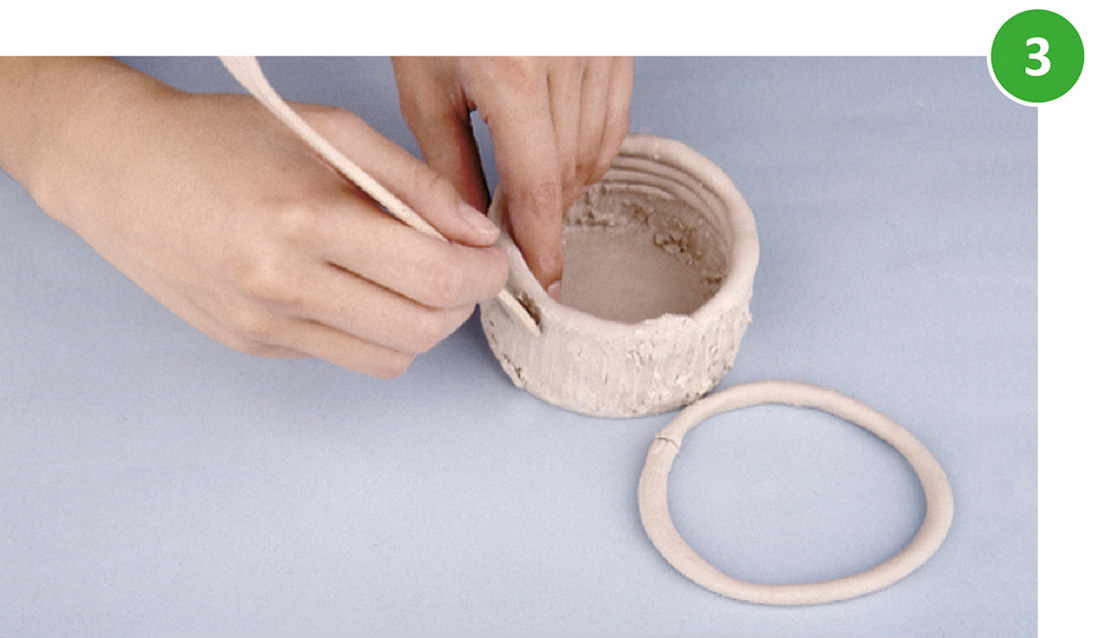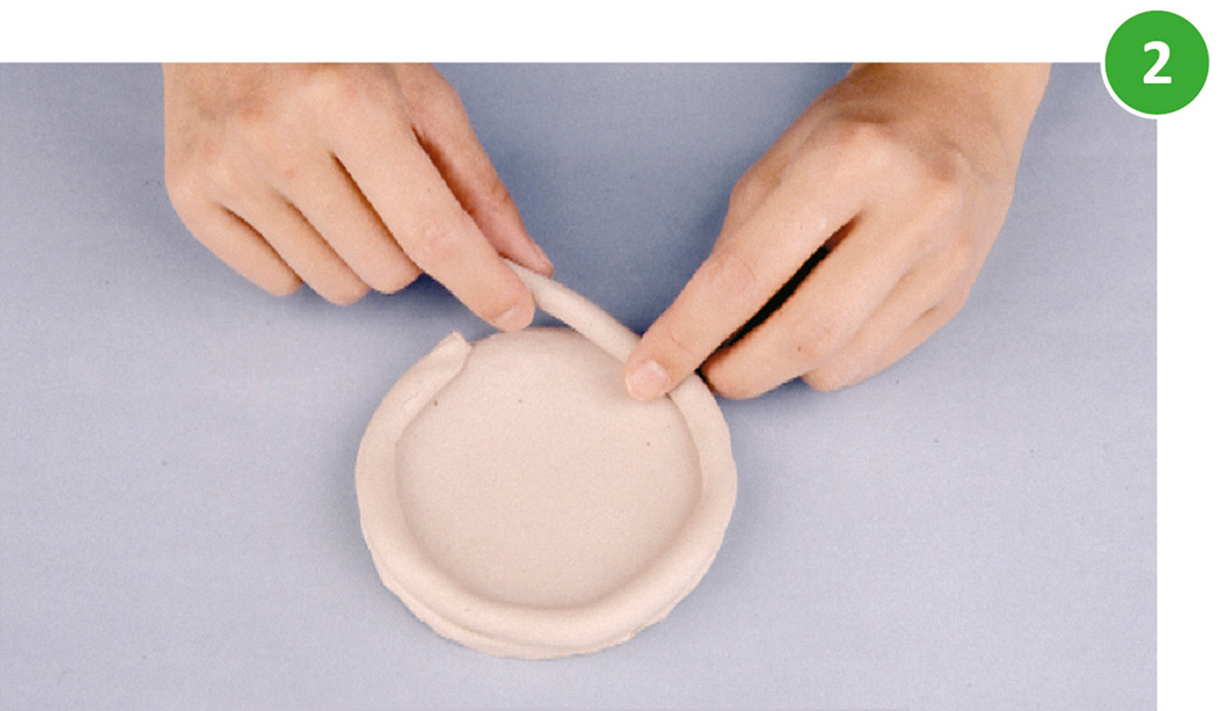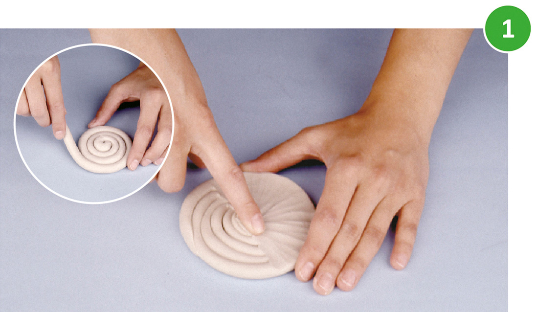 Per fer la base, enrotlla un xurro d’argila i allisa la superfície pressionant suaument amb els dits.