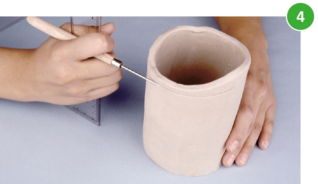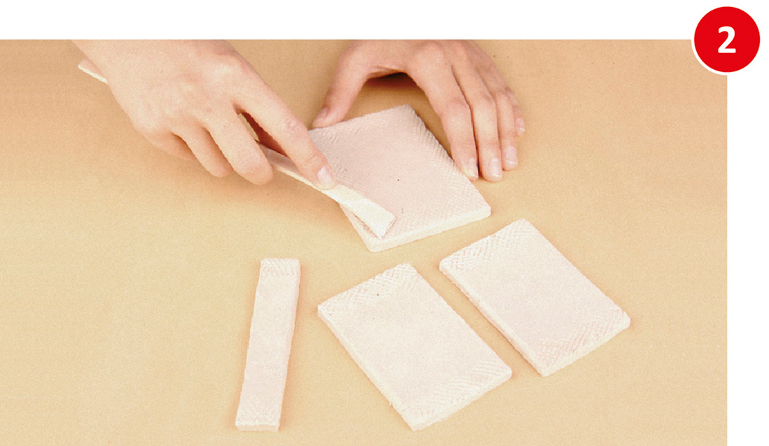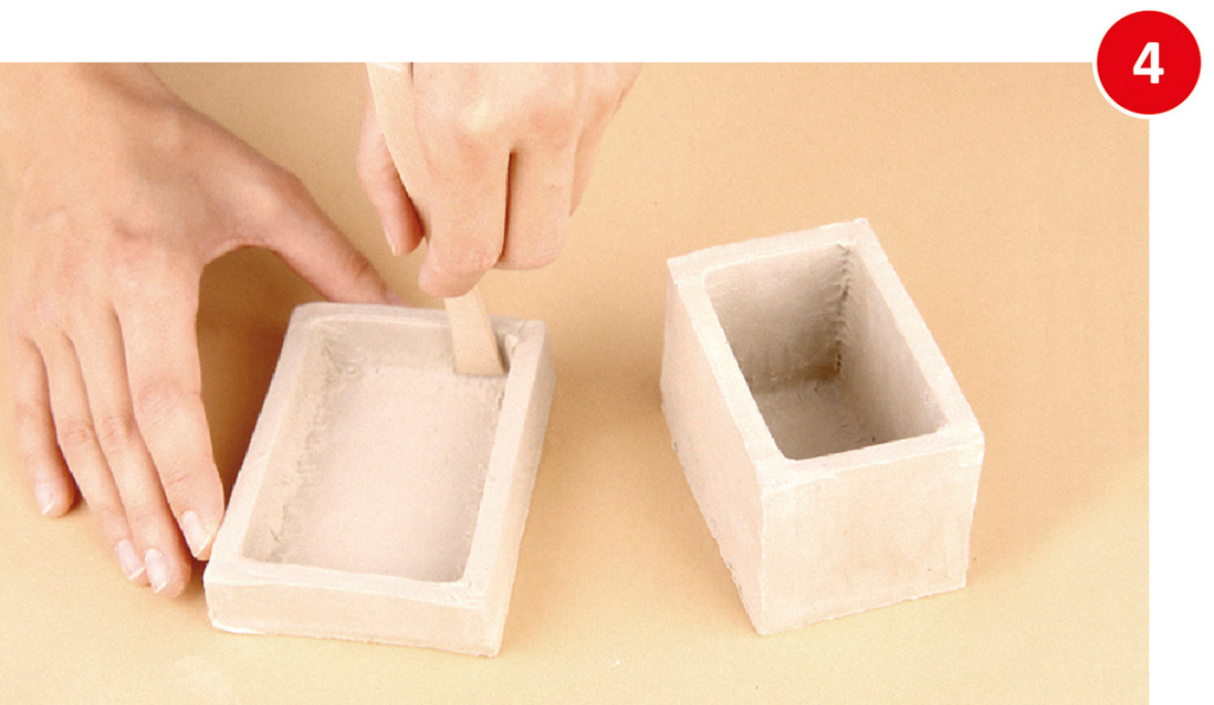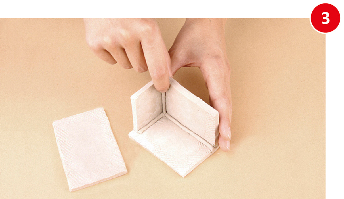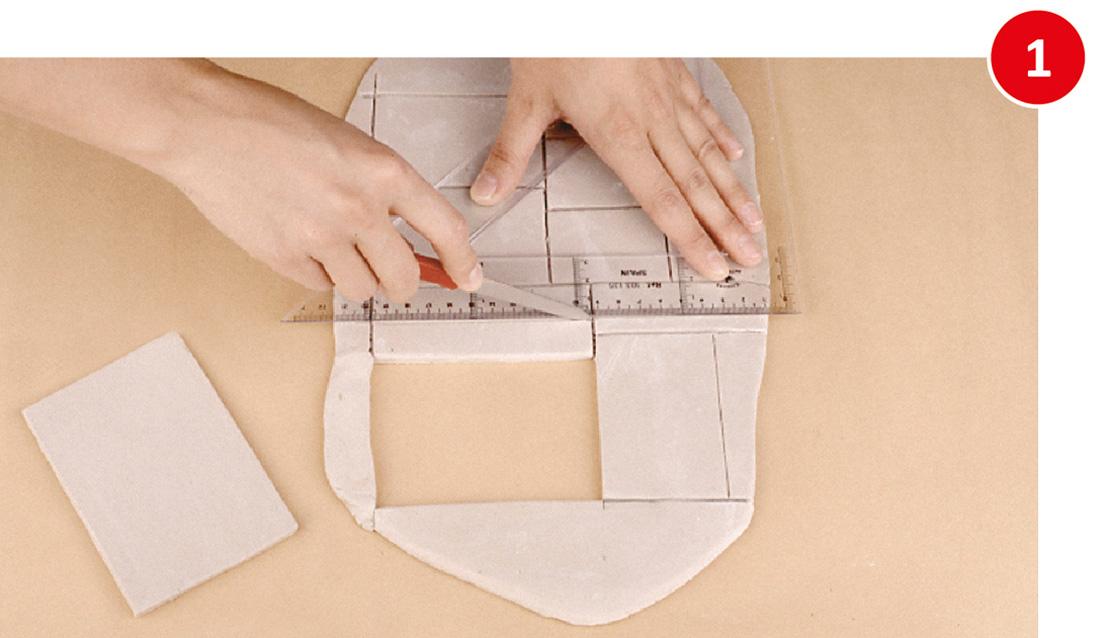 Sobre una planxa d’argila, marca i retalla totes les peces necessàries per formar la caixa i la tapa.
