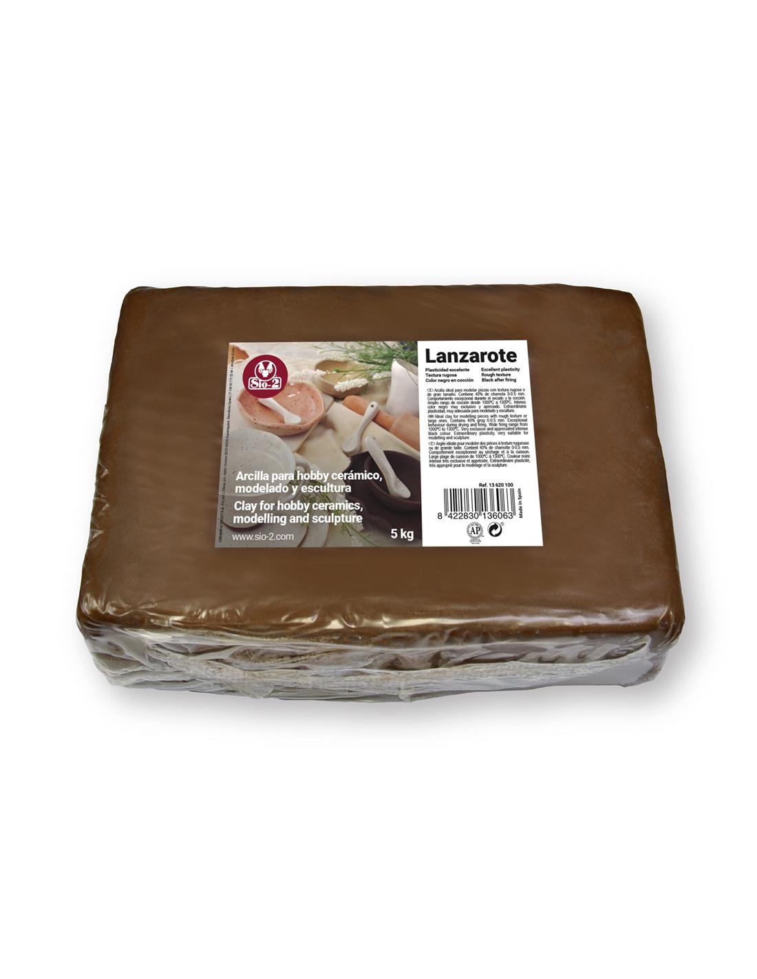 L'argila Lanzarote és ideal per modelar peces amb caràcter (textura rugosa) o de grans dimensions. Conté un 40% de xamota 0-0,5 mm, que li proporciona un comportament excepcional durant l'assecat i la cocció. És perfecta per hobby ceràmic doncs posseeix un ampli rang de cocció des de 1000ºC a 1300ºC, desenvolupant un intens color negre molt exclusiu i apreciat. Per la seva extraordinària plasticitat, tambíen és molt adequada per a modelatge i escultura.