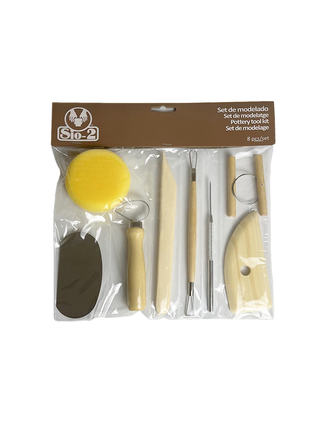 El set de modelado SIO-2® es el kit básico de herramientas que necesitas para iniciarte en el modelado con arcilla. Contiene: 1 esponja, 1 media luna metálica, 1 vaciador grande, 1 espátula de madera, 1 vaciador doble cara, 1 punzon, 1 hilo metálico, 1 media luna de madera.