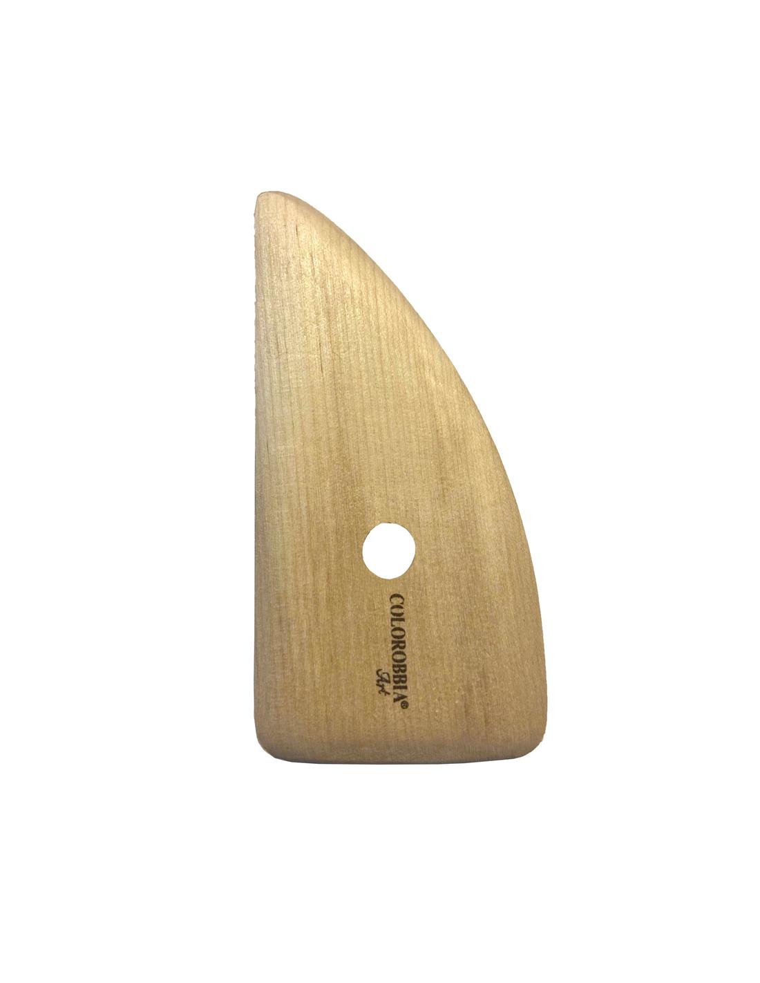 Herramienta de madera con bordes curvos ligeramente aplanados y afilados en el acabado.