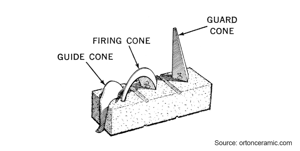 En cas de doute, il est recommandé d'utiliser des cônes pyrométriques pour vérifier la chaleur réelle reçue par les pièces lors de la cuisson. La chaleur dépend de la température du four, mais aussi du temps dans chaque plage de température, notamment dans la plage de température maximale. Les cônes pyrométriques sont conçus pour fondre en fonction de la chaleur reçue, ils commencent donc par se ramollir et finissent par se courber. La forme finale du cône nous donne une indication visuelle très précise de la chaleur réelle obtenue à l'intérieur du four. 3 cônes sont habituellement utilisés : le cône « guide », qui correspond à une température plus basse et se pliera complètement en reposant sur le support ; le cône « cuisson », qui correspond à la température souhaitée et qui va se plier, et le cône « garde », qui correspond à une température plus élevée et qui doit rester intact. Si la fusion des cônes ne correspond pas au résultat attendu, cela indique que la chaleur réelle que les pièces ont reçue n'a pas été correcte, soit par défaut (le cône de cuisson est resté intact), soit par excès (le cône de garde s'est plié).
