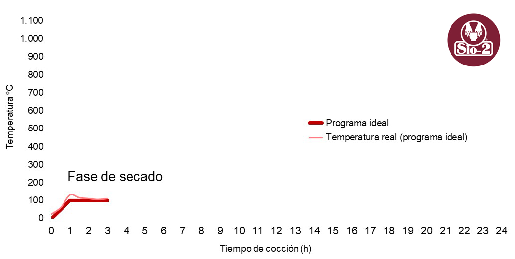 La phase de séchage est réalisée à 100 ºC et est maintenue pendant une période pour permettre à l'humidité résiduelle des pièces de s'évaporer. Le temps de séchage dépendra du type de pâtes, de la taille et de l'épaisseur des pièces ainsi que des conditions naturelles de séchage avant la cuisson. Étant donné qu'à 100 ºC le four ne consomme pratiquement pas d'énergie, il vaut mieux dépasser le temps que de le manquer. Si le four est équipé d'une cheminée, celle-ci doit être ouverte pour faciliter l'évacuation de l'humidité.