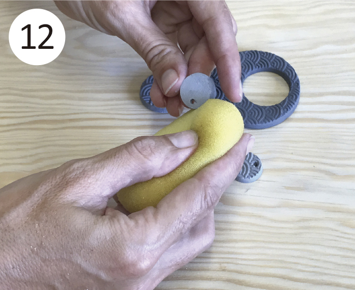 Lorsque les pièces se laissent manipuler sans se déformer (vous le verrez car elles commencent à changer de couleur), polissez les bords avec une éponge humide. Utilisez l'éponge pour lisser les irrégularités qui sont restées à la surface des pièces, telles que les plis, les rainures, etc.
