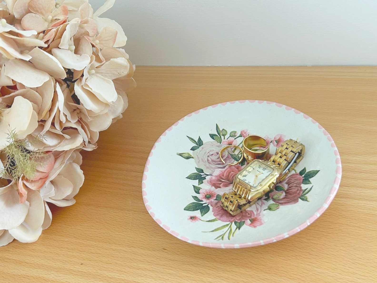 Ce délicat bol décoratif, réalisé avec de l’argile autodurcissante SIO-2 PLUS, est bien plus qu’un simple récipient : c’est une petite œuvre d’art. Décoré avec la technique du découpage et un élégant motif floral de roses, il devient un accessoire parfait pour ranger des bijoux, des clés ou des petits trésors du quotidien.