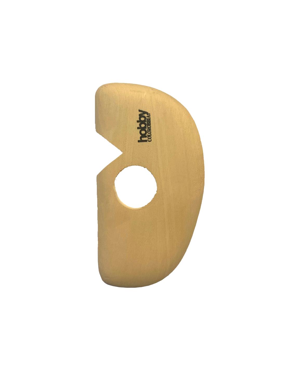 Herramienta de madera con bordes curvos ligeramente aplanados y afilados en el acabado.