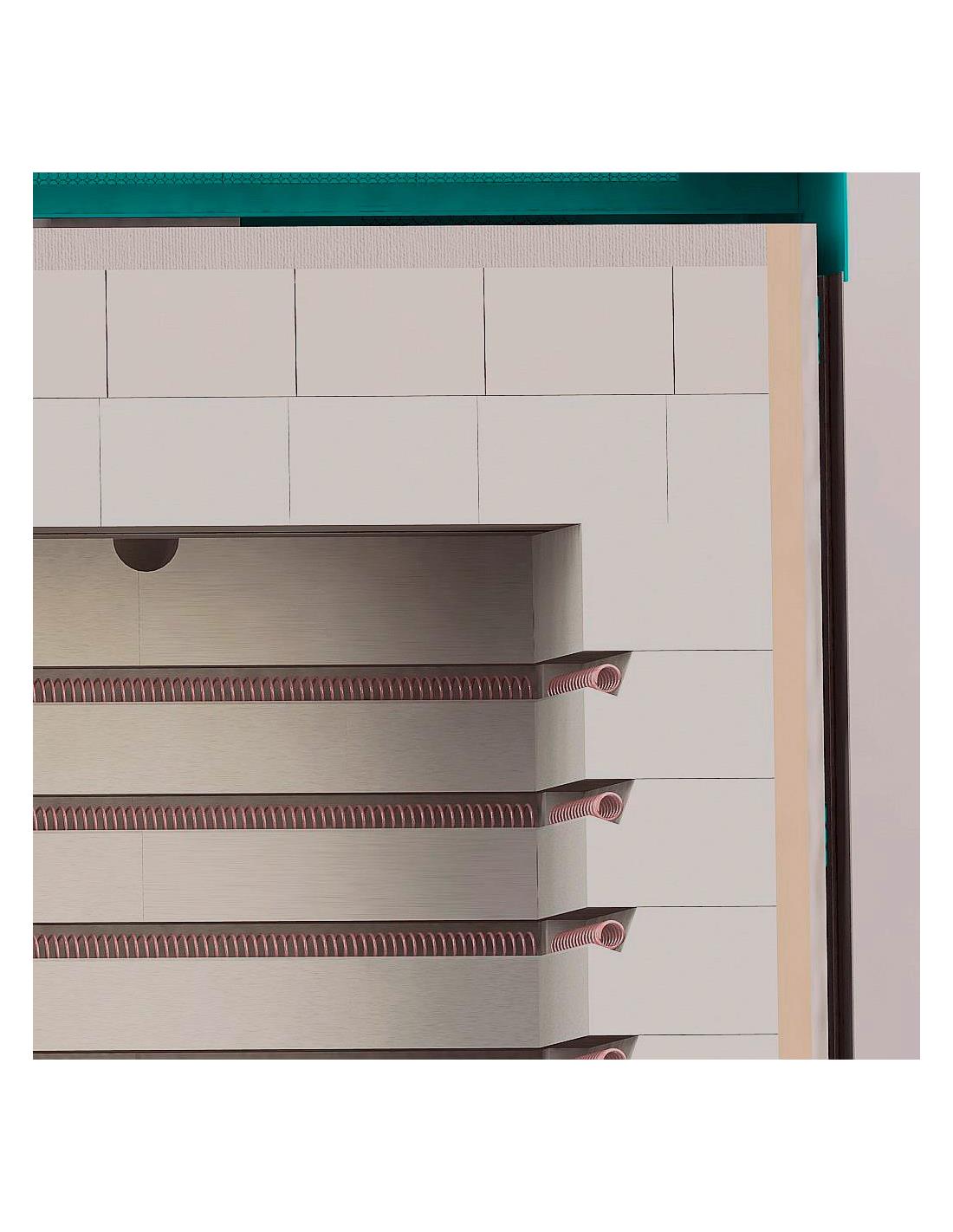 La serie KE-B destaca por su calefacción en 3 lados (laterales y solera), mediante resistencias protegidas por ladrillo ranurado perfeccionado, que garantizan una distribución térmica uniforme y eficiente. Además, el aislamiento térmico de 3 capas, exclusivo en los modelos de sobremesa como el KE 130 B, permite un mayor rendimiento con un menor consumo energético.