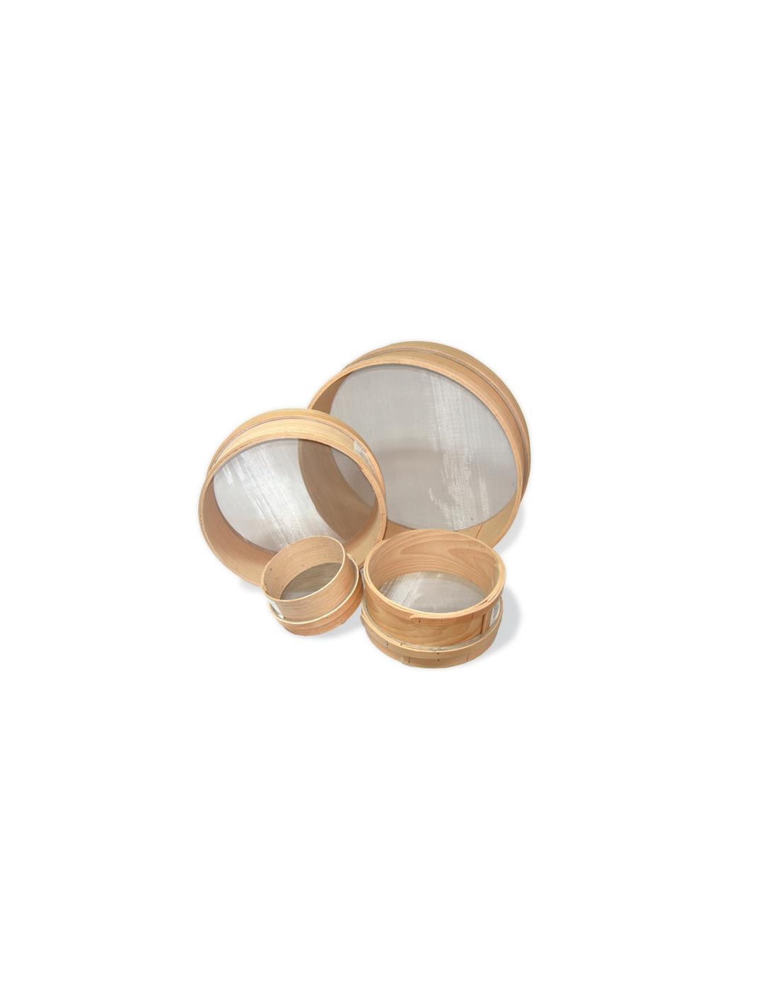 Tamiz de madera maciza de haya con malla fina de acero inoxidable de alta resistencia apta para separar granos por encima de 0.125 mm.