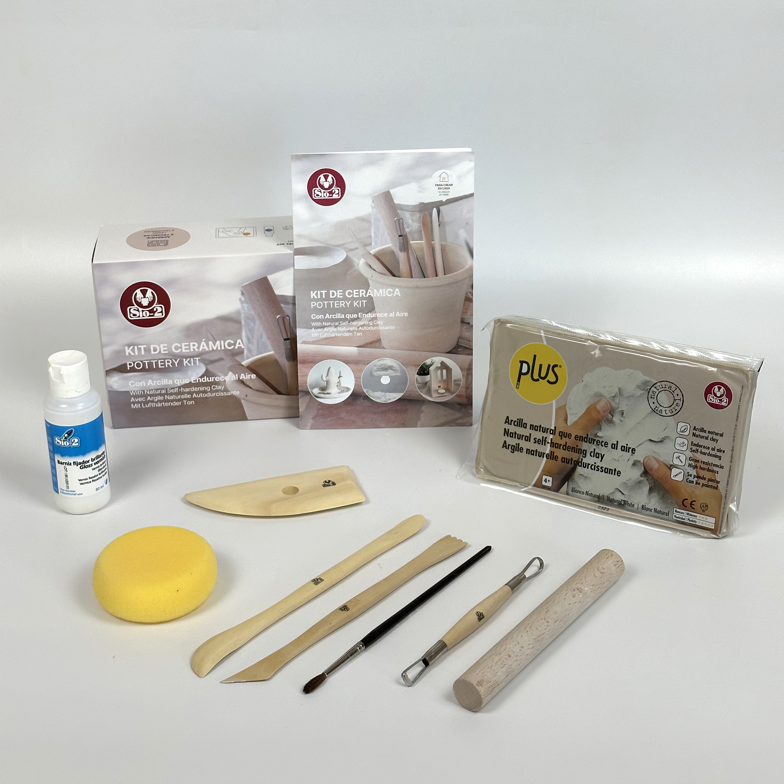 The ceramic kit contains 1 kg of SIO-2 PLUS® white clay, a high-quality clay that hardens in air, without the need for an oven or kiln, making it perfect for creating projects at home. You will also find the basic tools to start modelling: a roller, a ribbon tool, two modelling tools, a sponge, and a wooden rib; a glossy varnish (and brush) to protect and enhance your creations with a professional finish, and a detailed dossier with three essential techniques and ideas for creating ceramics at home.
