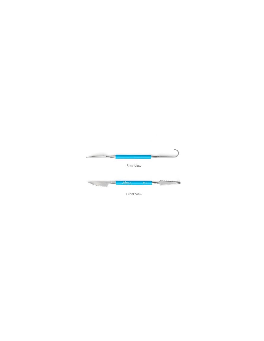 Serie profesional. Esta herramienta de doble extremo tiene un gancho con diente fino en un extremo y un cuchillo con dientes finos medianos en el otro extremo. Está hecho de acero inoxidable de alto grado y forjado a mano para convertirse en una herramienta sólida e irrompible. Confeccionado en goma de colores brillantes para mayor comodidad y agarre seguro, es divertido de usar, fácil de encontrar y no se desplaza de la mesa. Es ideal para cortar, rebanar, rayar, raspar, texturizar, refinar, moldear y remover arcilla.